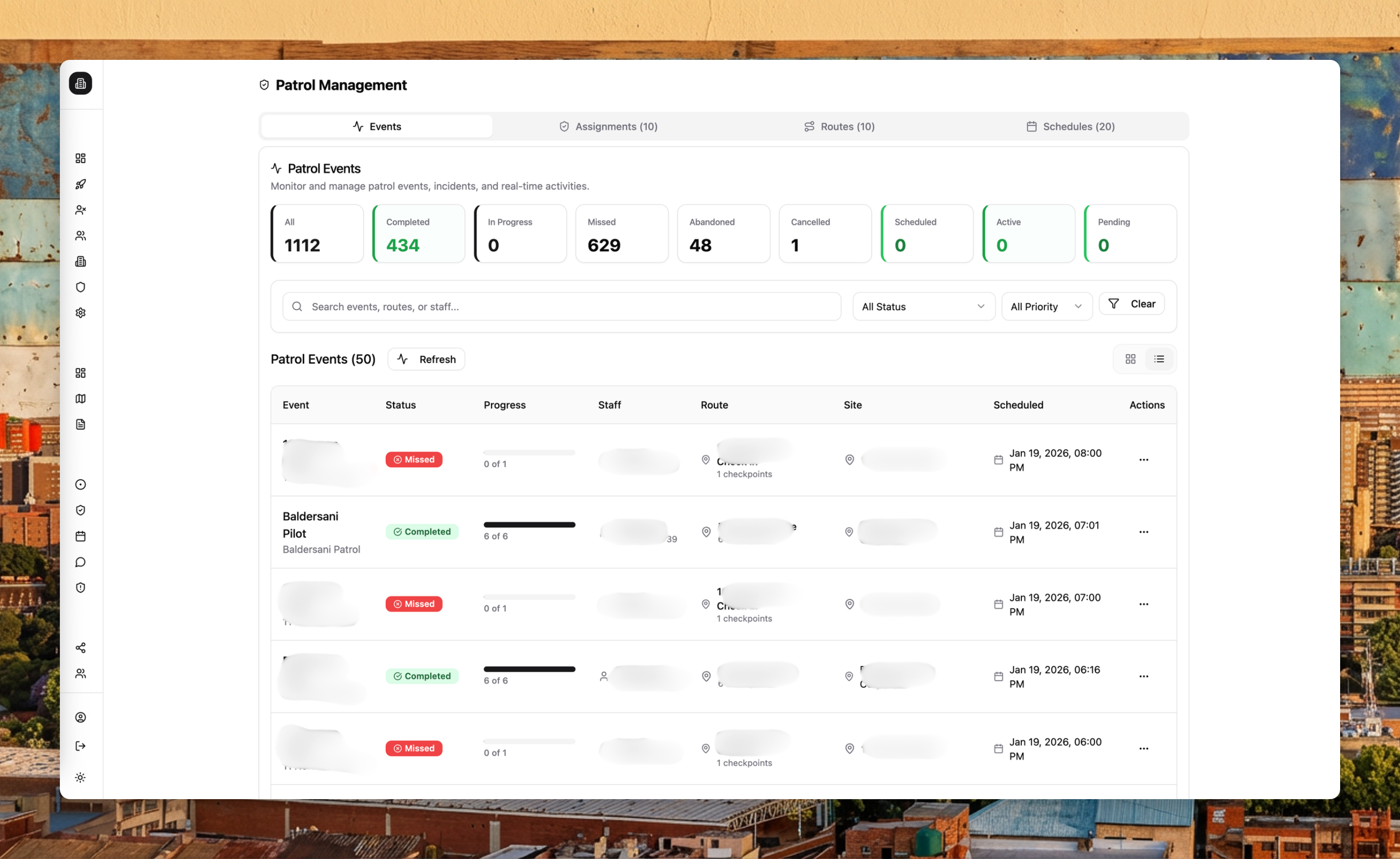 - Events: View patrol outcomes and statuses (completed, in progress, missed, abandoned, cancelled, scheduled, active, pending).