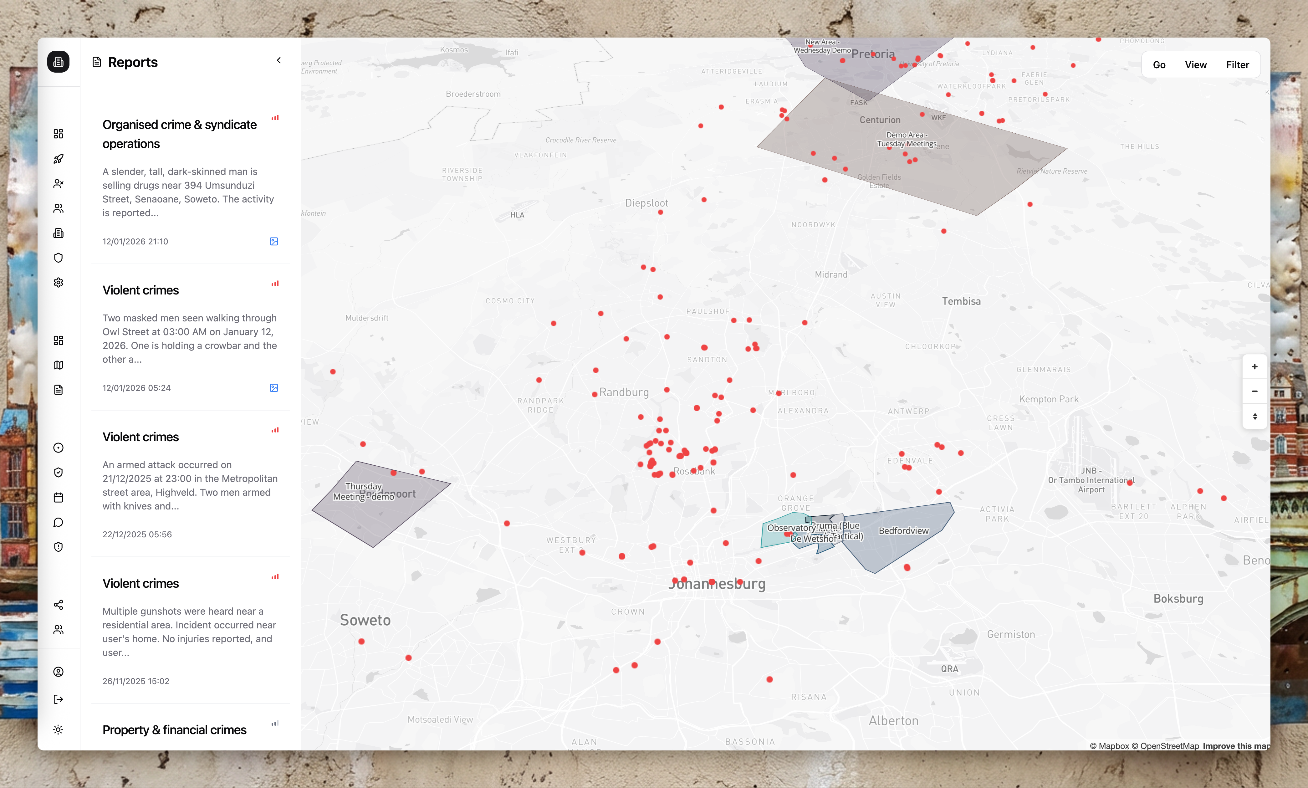 Live Map shows incidents and areas in real time. Use it to visualise reports, review report details, and understand what is happening across your sites. Enterprise users see richer context than the public—full conversation history, media, and timestamps.