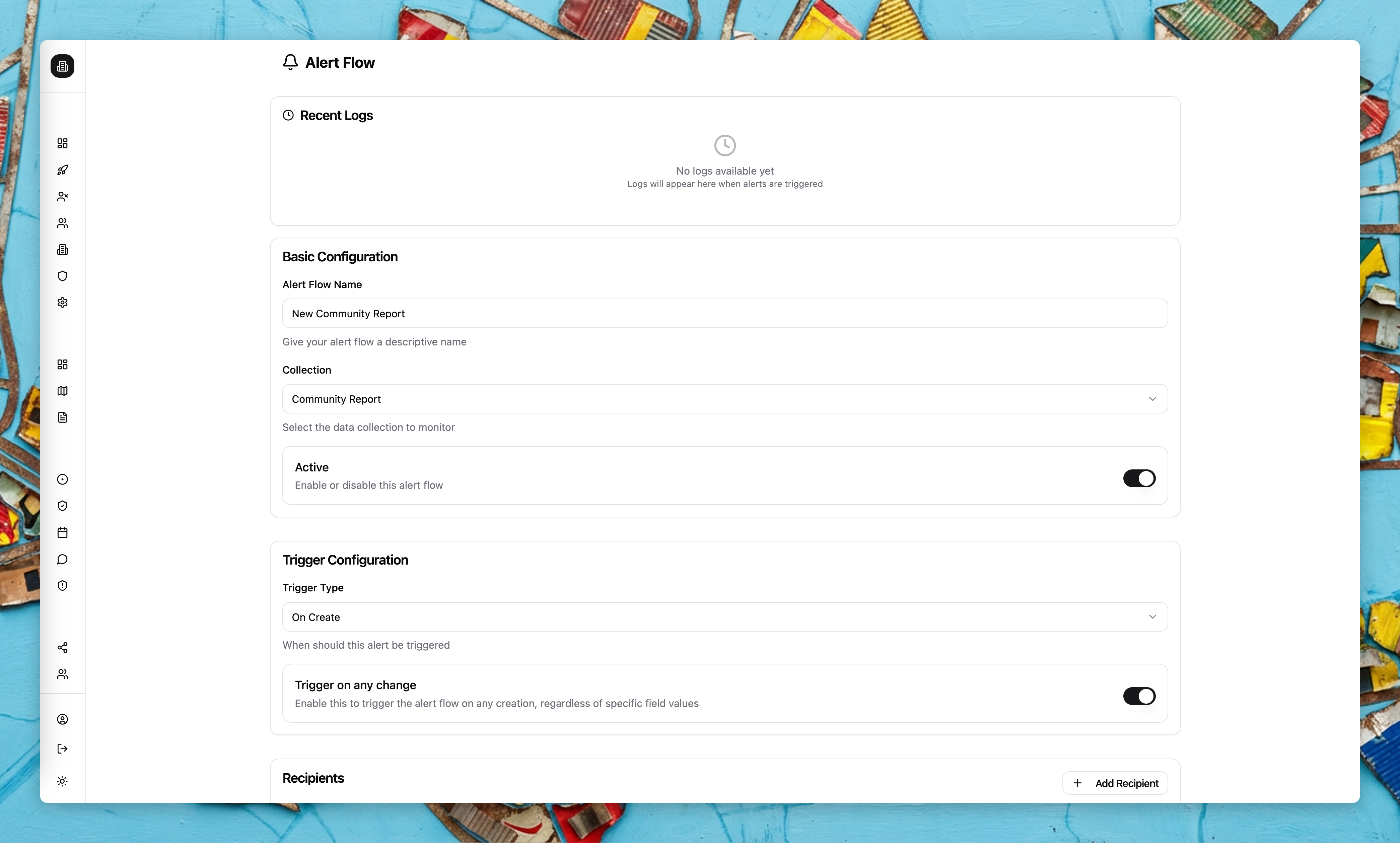 Alert Flows trigger notifications when key data changes. Use them to alert teams about new reports, patrol events, or access control activity.