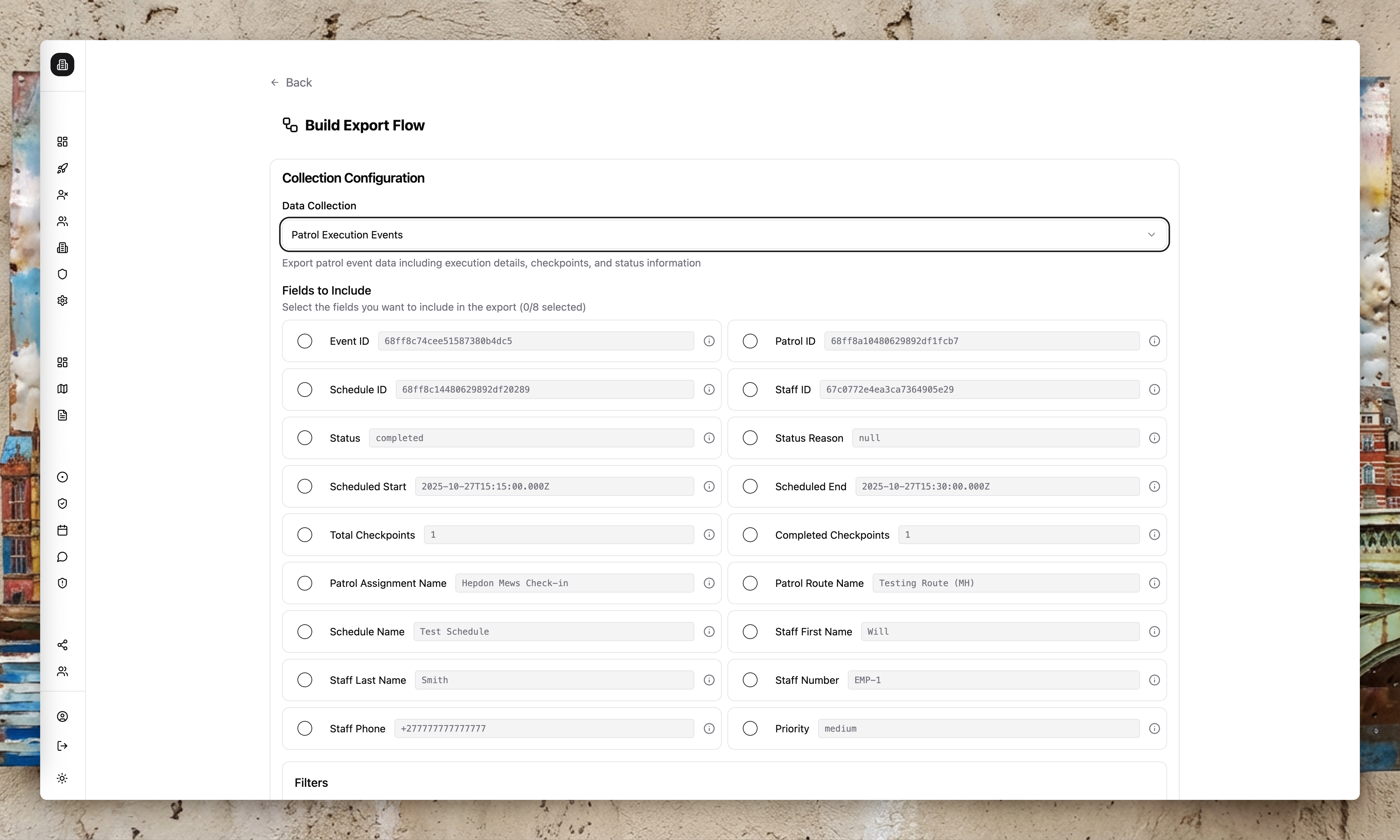 | Daily patrol summary | Collection: Patrol Events, Filter: Site = "Office Park", Schedule: Daily 6am, Recipient: ops-manager@company.com |